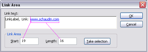 Figure 3: The Link Area dialog box displaying the LinkLabel caption text "LinkLabel, Link: www.schaudin.com." Here the text starts at position 19 and has a total length of 16 characters. |